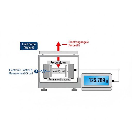 When a sample is placed on the pan, the electromagnetic coil inside generates a restoring force to counterbalance the weight. The current required to create that force is directly proportional to the sample’s mass.